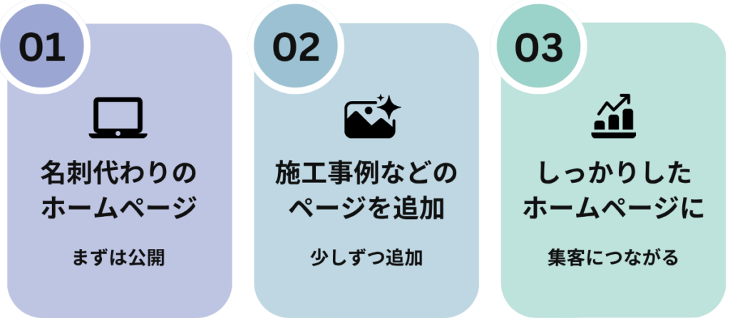 最初は、名刺がわりのシンプルなホームページで大丈夫です。まずは公開することが大切。そのうえで、少しずつページや施工事例を増やしながら、情報がしっかり伝わる、問い合わせにつながりやすいホームページへ育てていきましょう。